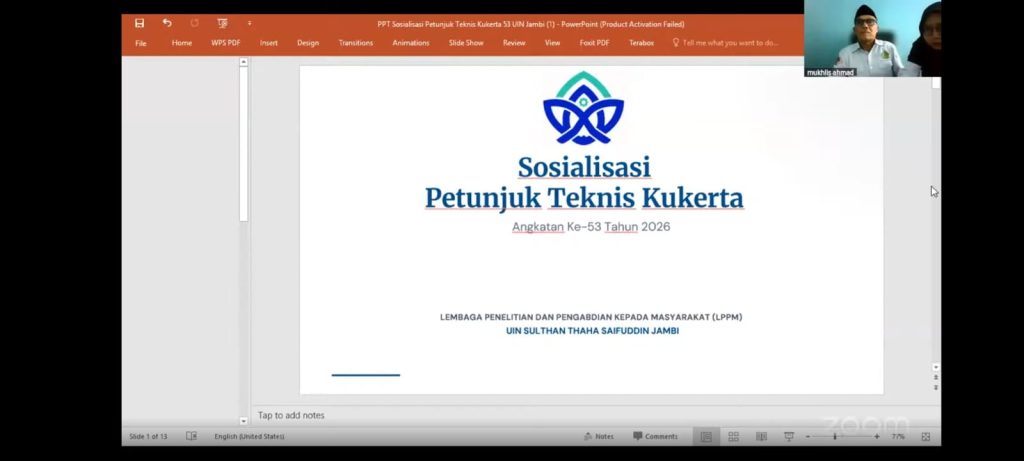 JAMBI – Lembaga Penelitian dan Pengabdian kepada Masyarakat (LPPM) UIN Sulthan Thaha Saifuddin Jambi menggelar sosialisasi Petunjuk Teknis (Juknis) Kuliah Kerja Nyata (Kukerta) Angkatan 53 Tahun 2026 pada Selasa (7/4/2026). Mengingat pentingnya pemahaman prosedur bagi calon peserta, kegiatan ini dilaksanakan secara daring melalui platform Zoom Meeting.
