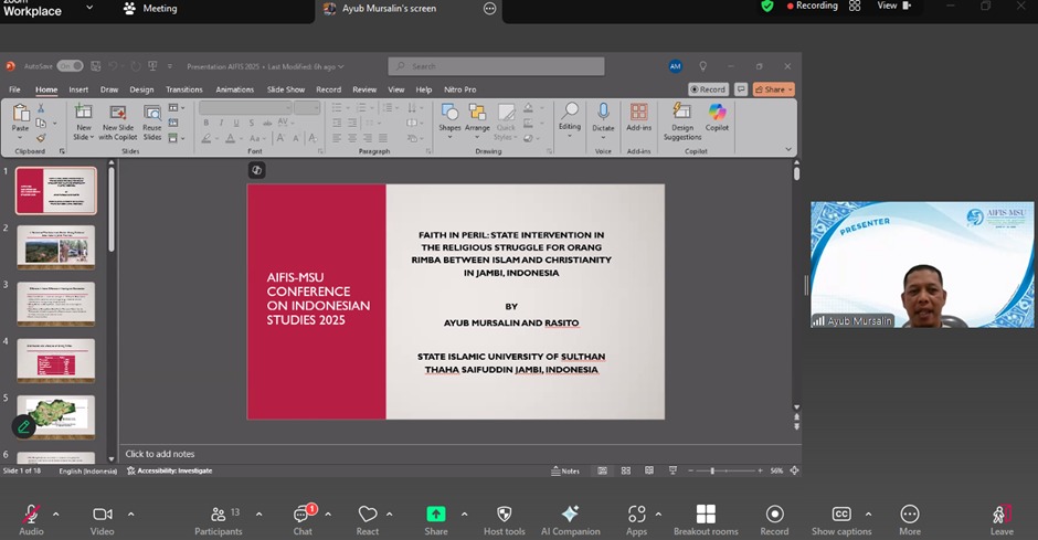 Sejumlah dosen dari UIN Sulthan Thaha Saifuddin Jambi kembali menunjukkan kiprah akademiknya di kancah internasional melalui partisipasi dalam konferensi yang diselenggarakan oleh The American Institute for Indonesian Studies (AIFIS), sebuah lembaga akademik bergengsi yang berfokus pada kajian-kajian tentang Indonesia. Kegiatan ini diinisiasi oleh Michigan State University (MSU), Amerika Serikat, dan menjadi forum penting bagi para akademisi untuk mendiskusikan isu-isu strategis terkait Islam, pendidikan, dan kebudayaan lokal Indonesia, termasuk dari Provinsi Jambi.