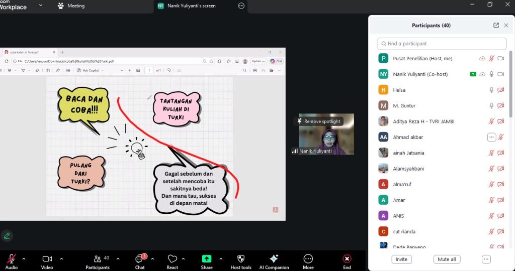 Acara yang berlangsung selama lebih dari satu jam inidibuka oleh Ketua LPPM, Dr. Fridiyanto, dan dimoderatori langsung oleh Koordinator PLKI, Dr. Dion Ginanto. Sosialisasi menghadirkan Nanik Yulianti, penerima beasiswa Turki yang kini tengahmenempuh studi doktoral di Universitas Islam Internasional Indonesia (UIII).